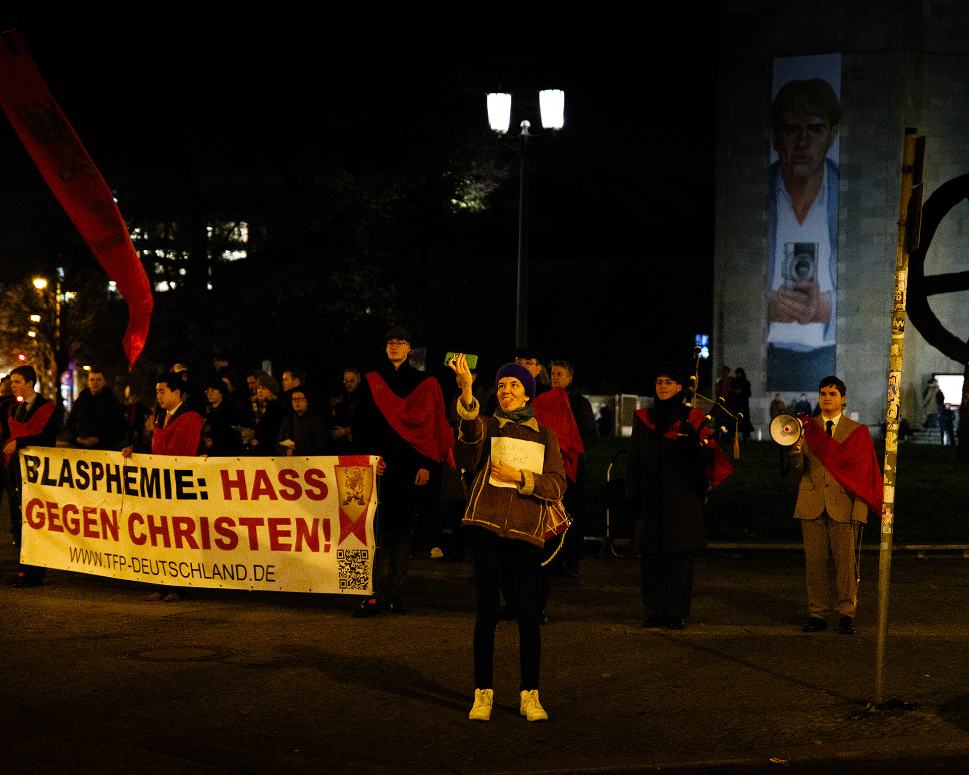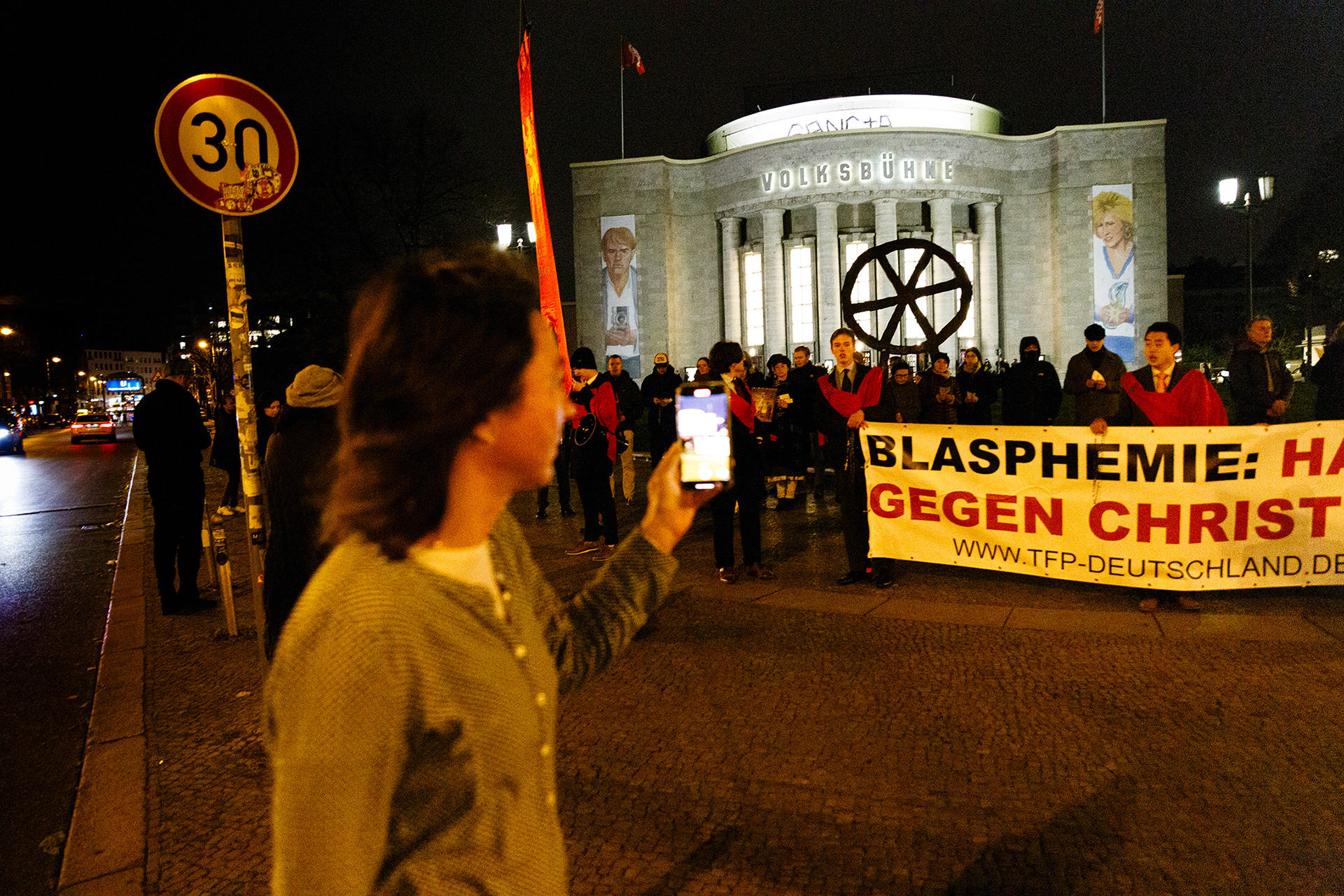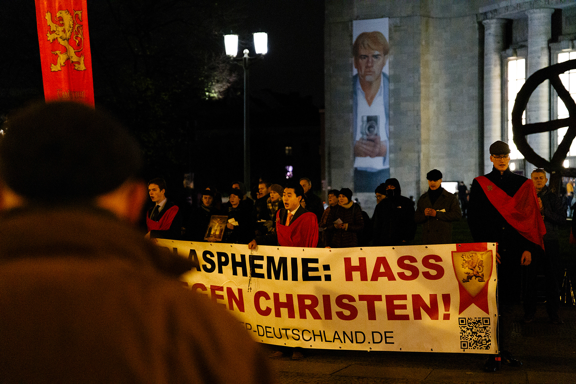TFP demonstrators with banner calling the opera Sancta a blasphemous act against christianity. Berlin, Germany 2024